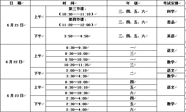 1. 6月21日(周三)上午第三、四节课三~五年级考科学、品德与社会,下午三~六年级考英语,时间为:15:50~16:50(一~二年级学生下午两节课后放学)。